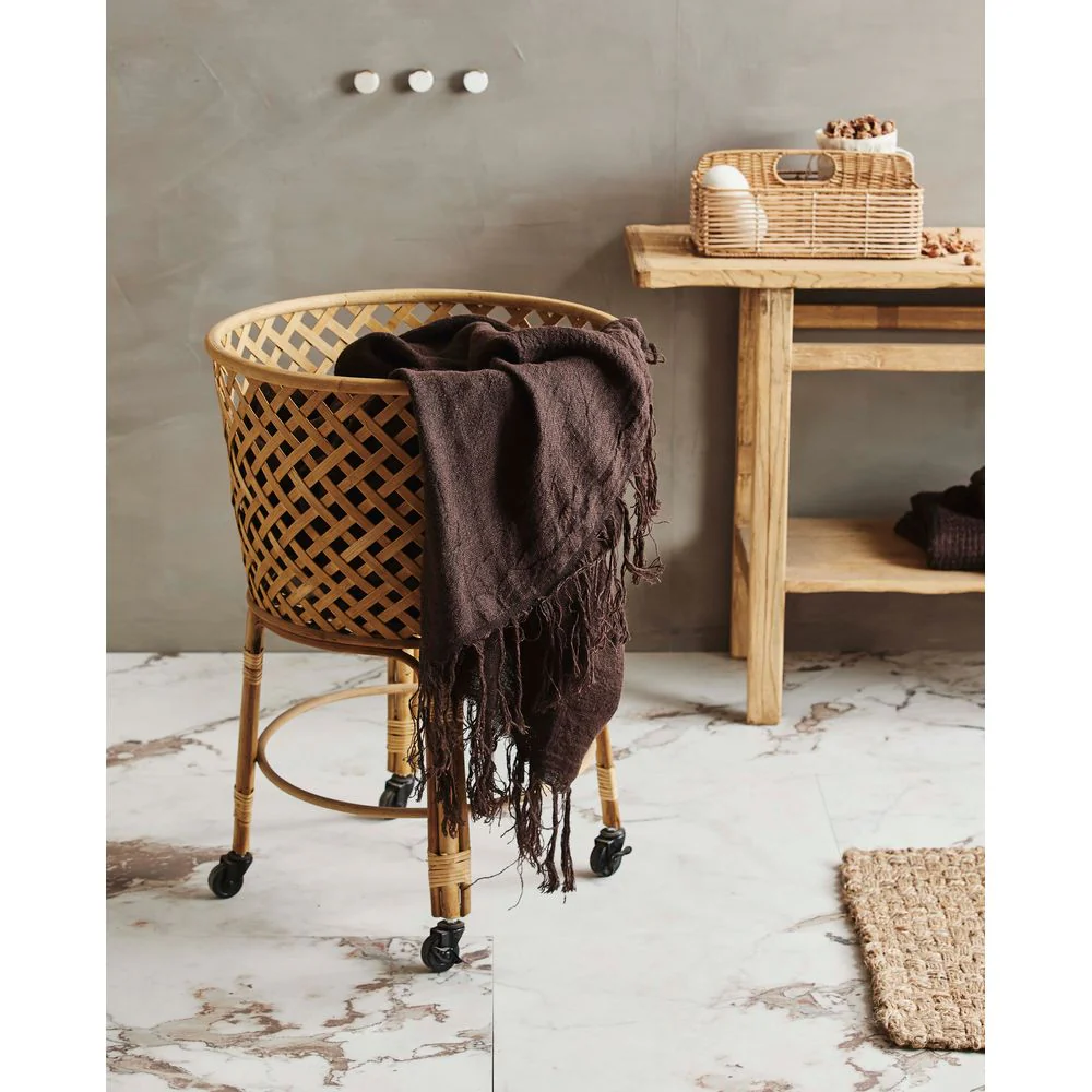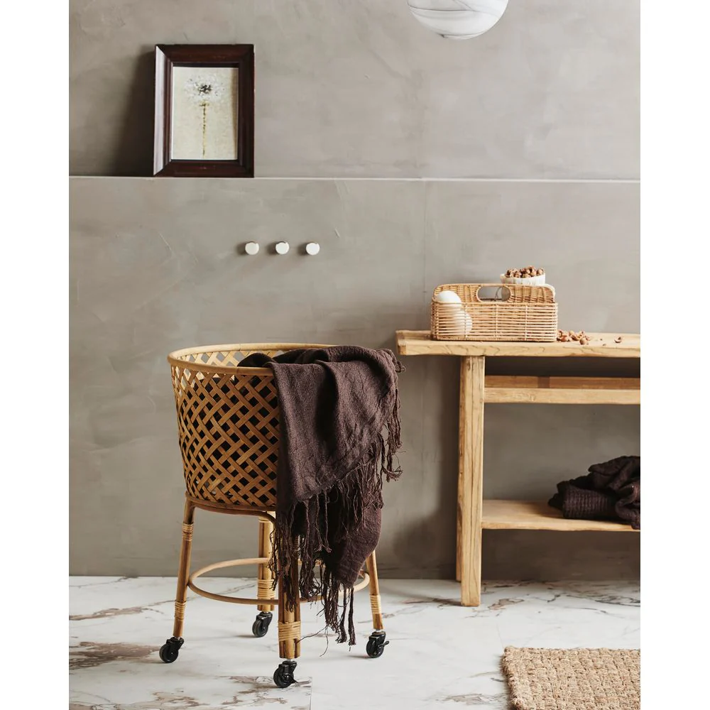 Een handige mand op wielen gemaakt van bamboe. Het materiaal is natuurlijk en kan variĆ«ren in grootte, kleur en uiterlijk – dit maakt deel uit van het ontwerp. Gebruik hem voor de was, kinderspeelgoed of andere van je favoriete opbergspullen. Is ook verkrijgbaar in een andere vorm. Maximaal gewicht: 16 kg.
