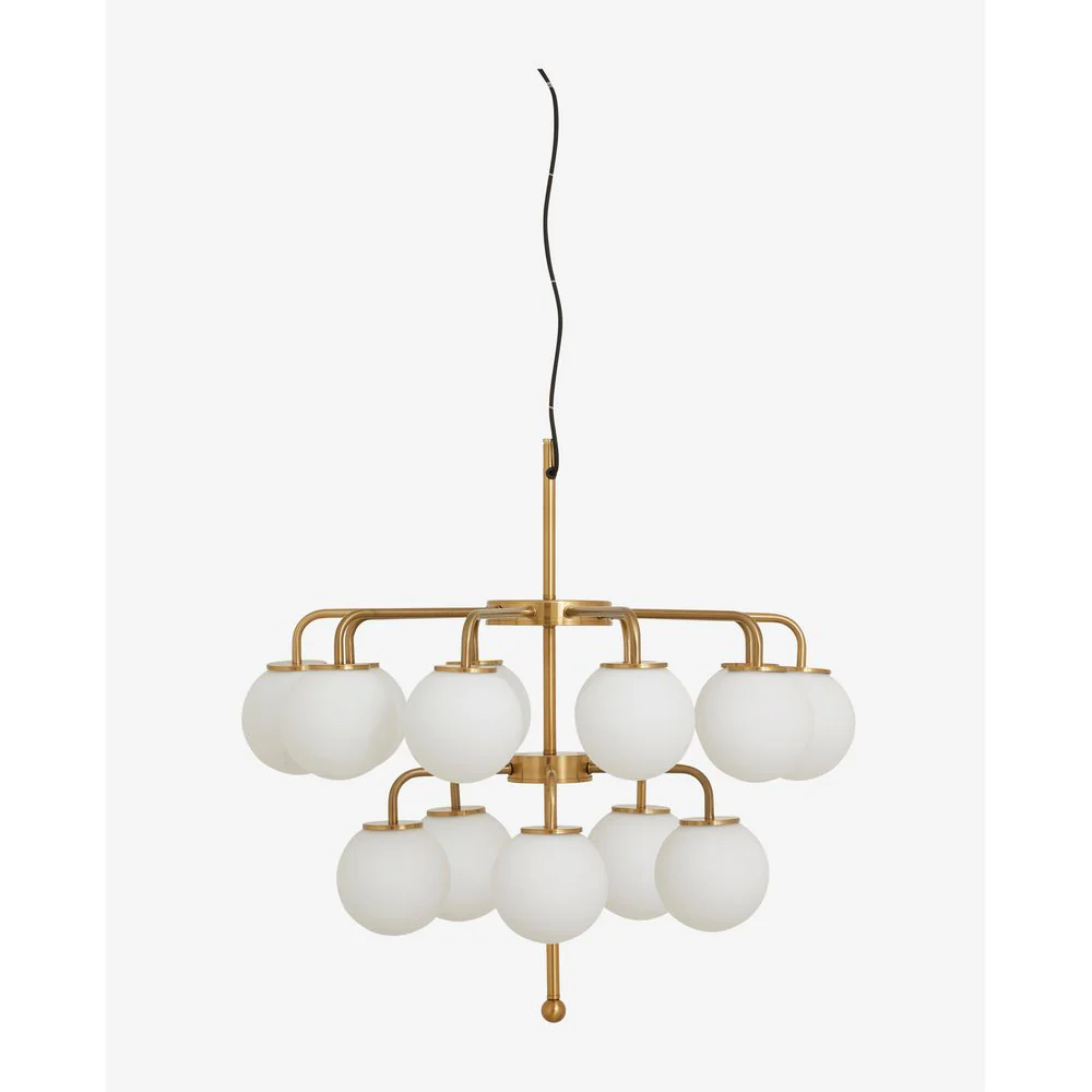 PALMA kroonluchter van verchroomd mat messing heeft 15 fittingen met glazen bollen. De kroonluchter wordt plat verpakt geleverd en er volgt een instructie voor de montage. De lamp hangt aan een dun ijzerdraad en een 1,50 m lang zwart stoffen snoer.
