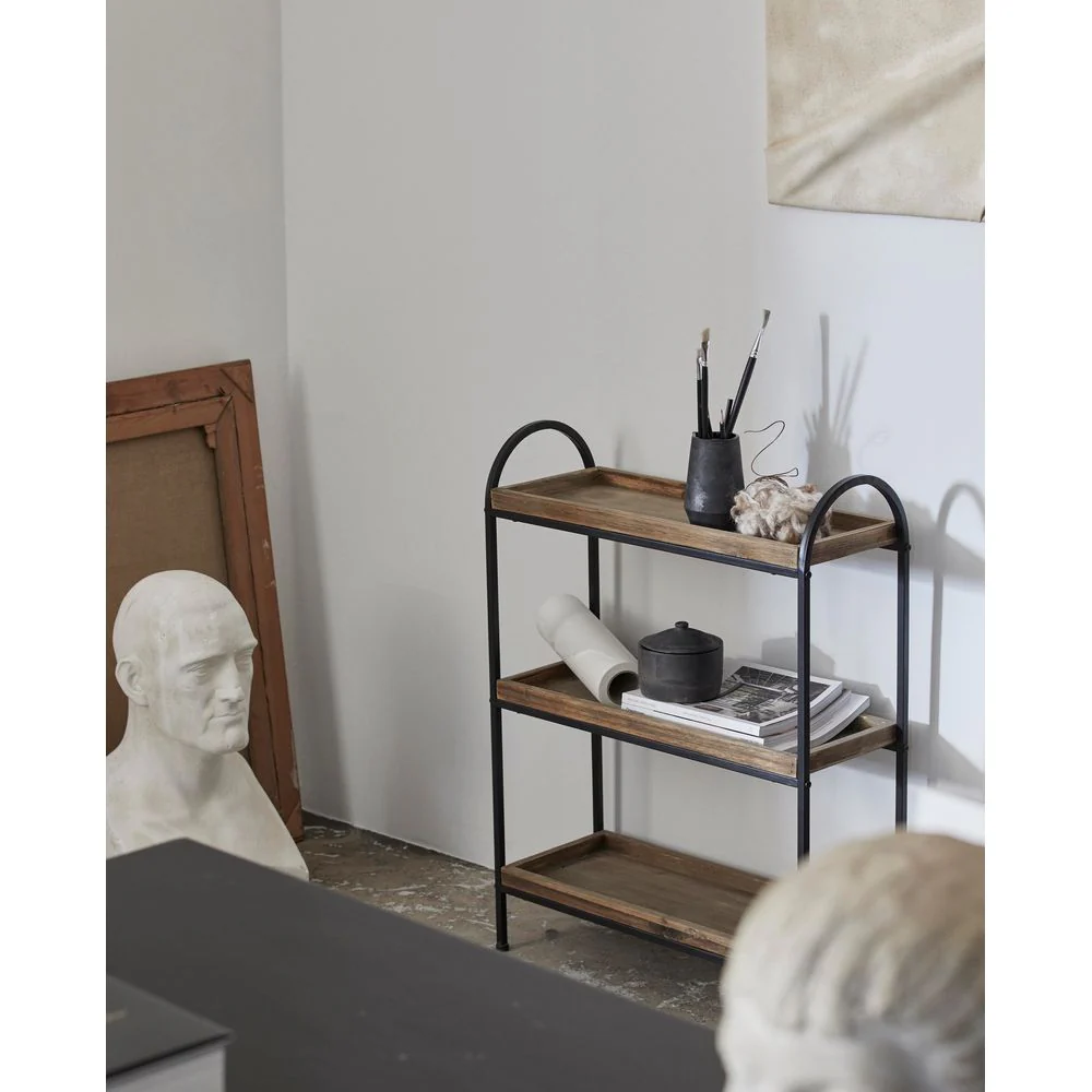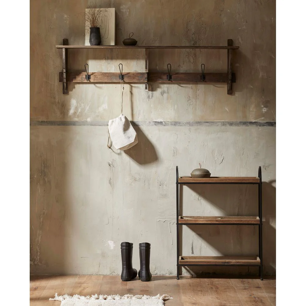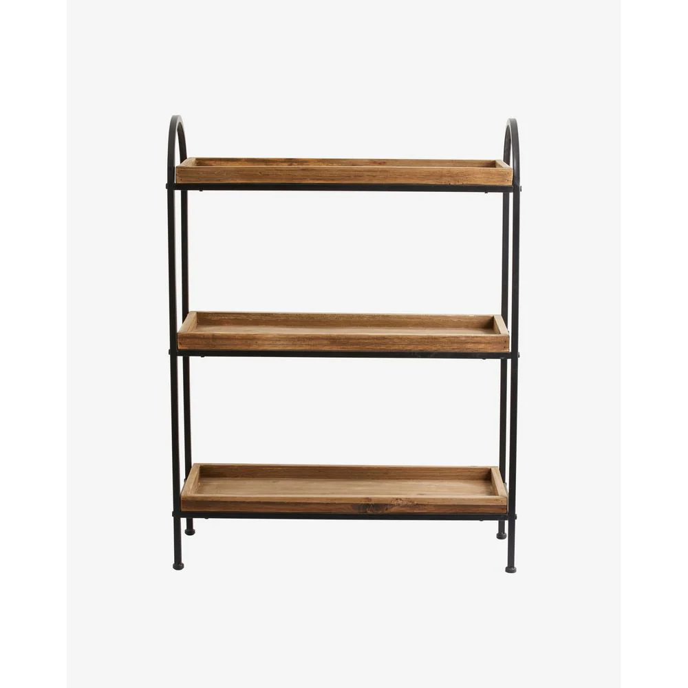 PATNA rek van hergebruikt hout met drie planken. Een rustiek en eenvoudig rek met een zwart gelakt ijzeren frame en planken van hergebruikt hout. PATNA is een praktisch rek dat gebruikt kan worden als extra meubelstuk in uw kantoor of keuken, waardoor u meer opbergruimte krijgt. PATNA helpt bij het creëren van een rustige, comfortabele sfeer in elke kamer, en de warme, organische uitstraling zorgt ervoor dat het opvalt in contrast met een verder licht decor. Omdat het product is gemaakt van teruggewonnen hout, zal het qua uiterlijk variëren met scheuren , knopen en kloven, die geen gebreken zijn, maar deel uitmaken van het uiterlijk en de unieke charme. Er kunnen onregelmatigheden in het hout en oneffenheden voorkomen. Max 5 kg pr. planken. Afstand tussen de planken: 25 cm. Niet gemonteerd.