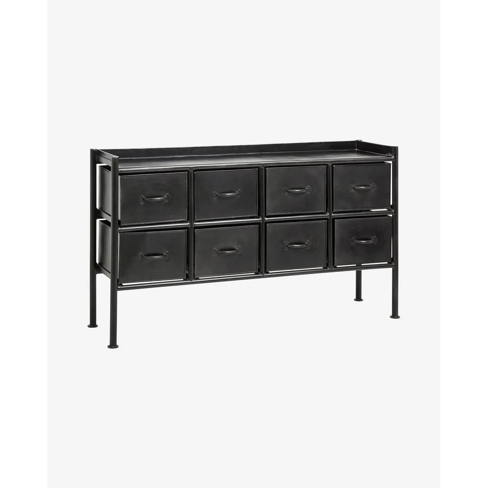 PORTLAND is gemaakt van ijzer met een zwarte poedercoating.#Het heeft 8 lades en een iconische opstaande rand rond de bovenplaat.