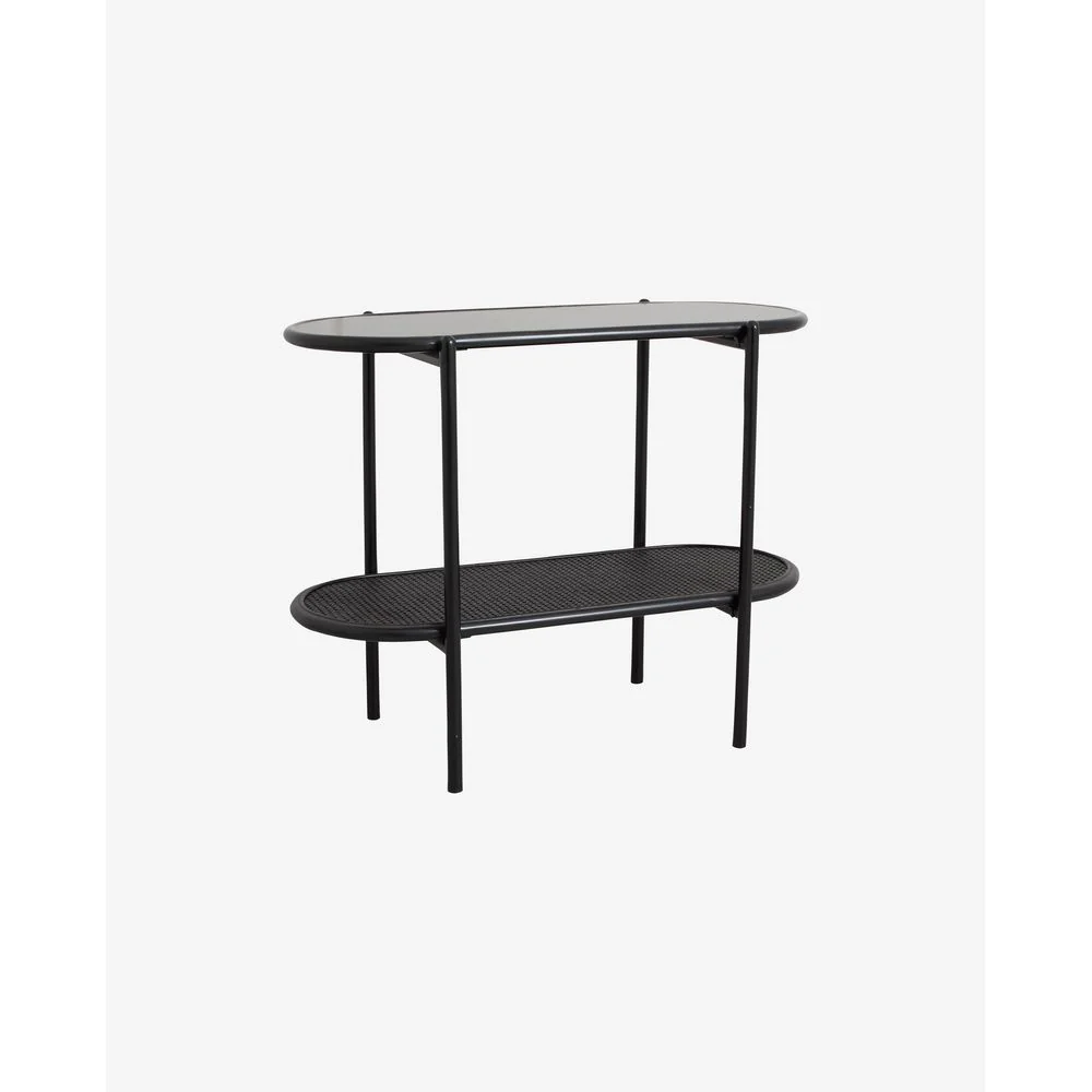Een bijzettafel van rotanvlechtwerk voor decospullen of kleine opbergers.