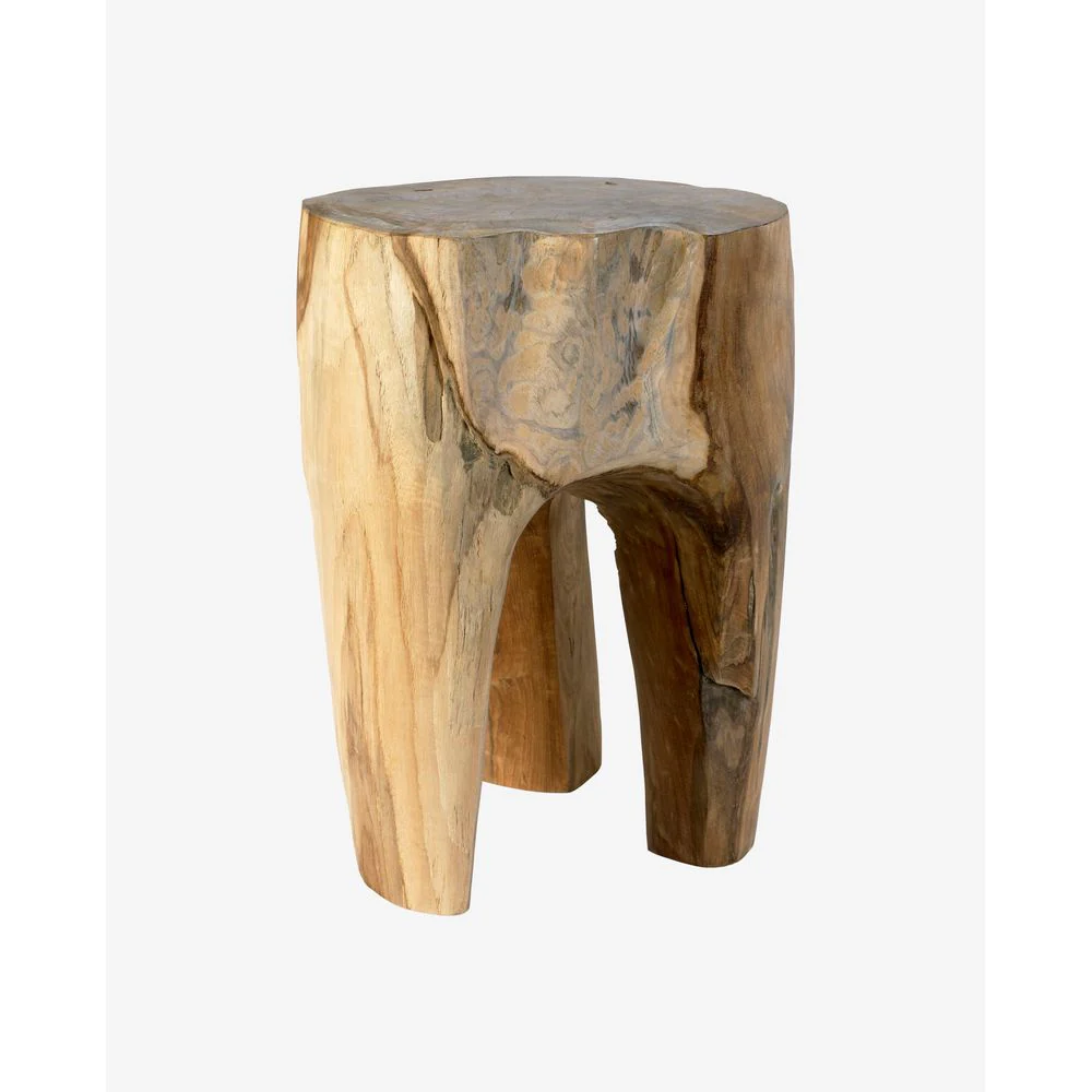 Een houten kruk die is gemaakt van teakhoutwortels. Elke kruk is uniek. De kruk kan gebruikt worden om op te zitten of als bijzettafel.