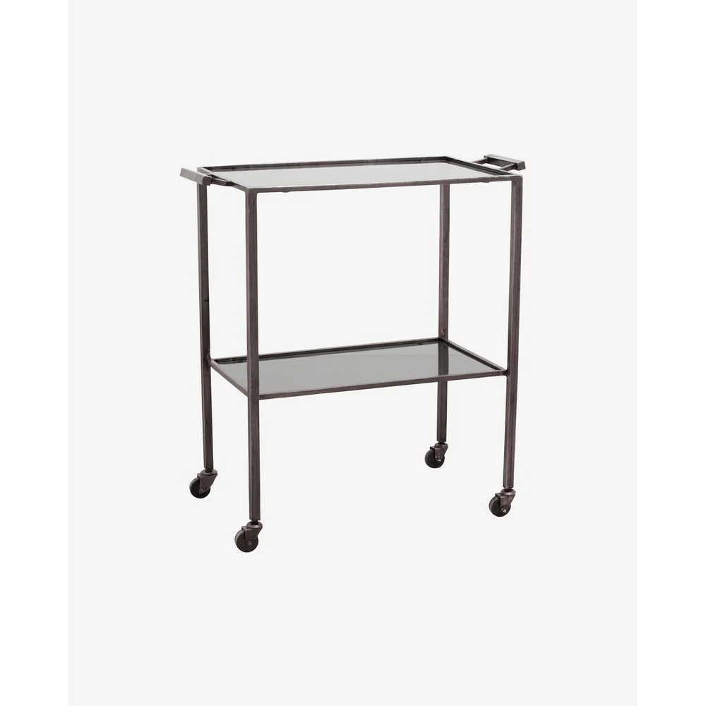 Een elegante trolley met een gungrijze metalen afwerking en planken van zwart glas met 4 wielen. Gebruik hem waar wat extra presentatieruimte nodig is of als je thuisbar.