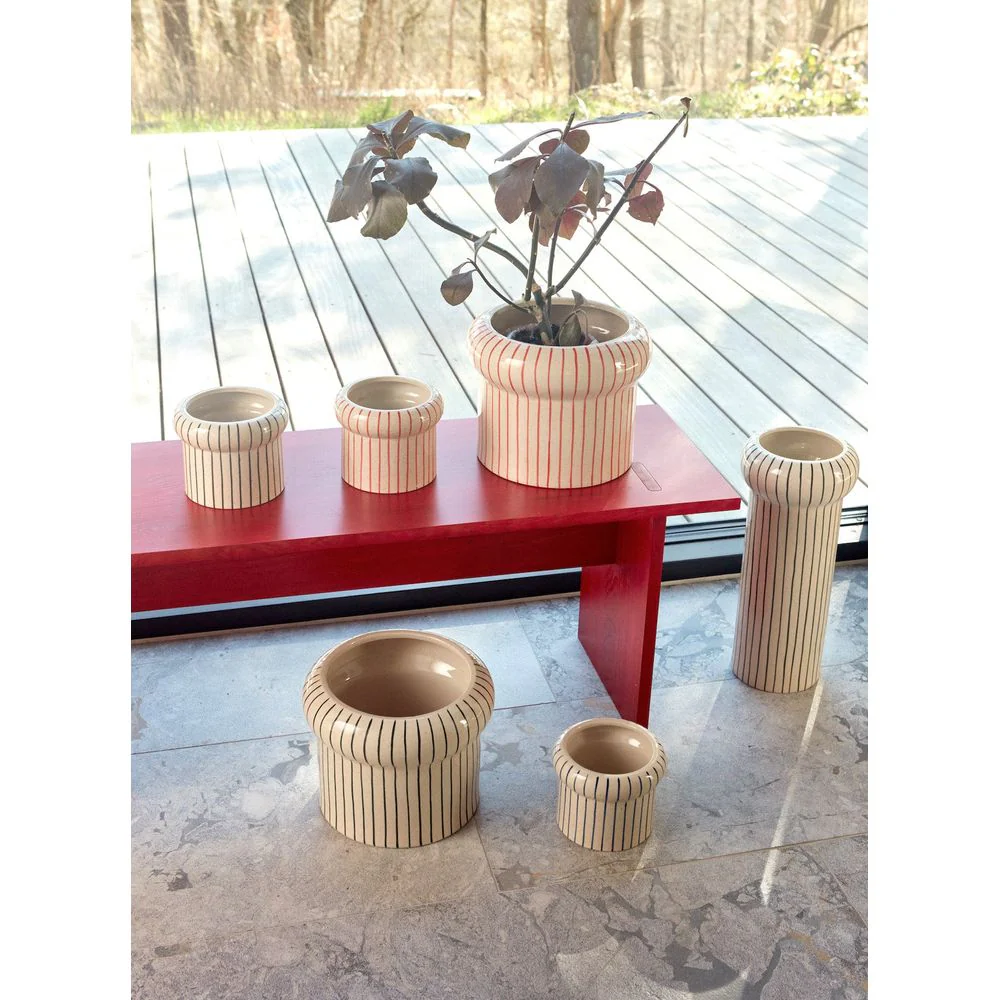 Maak je planten nog mooier met de Aki Pot in groot formaat. Met zijn vrouwelijke vorm en speelse, handgemaakte strepen verfraait hij elk raam, boekenkast of tafel en voegt hij een discreet vleugje kleur toe aan elke kamer van het huis.