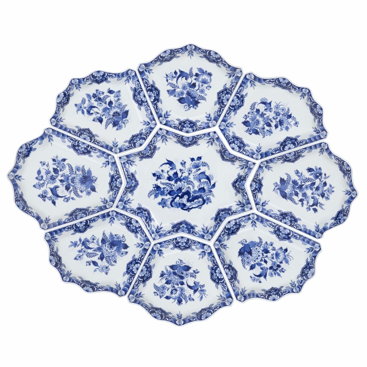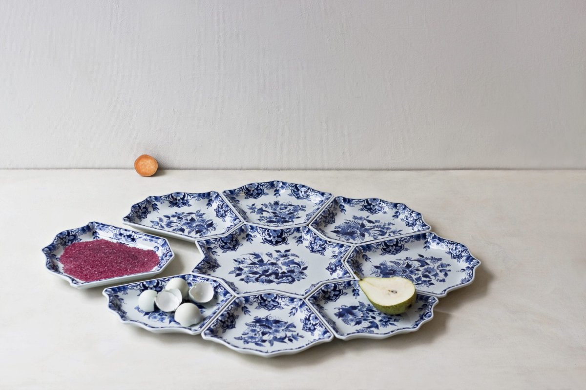 Hier ziet u een set schalen met een lange geschiedenis in Delfts Blauw. Rond 1700 waren de schalen van dit Delfts Blauwe servies bedoeld om gekonfijt fruit te presenteren. Het maken van gekonfijt fruit was een tijdverdrijf voor welgestelde dames en prinsessen. In de inventarissen van koninklijke prinsessen worden honderden soorten schalen voor gekonfijt fruit in Delfts Blauw aardewerk genoemd.
