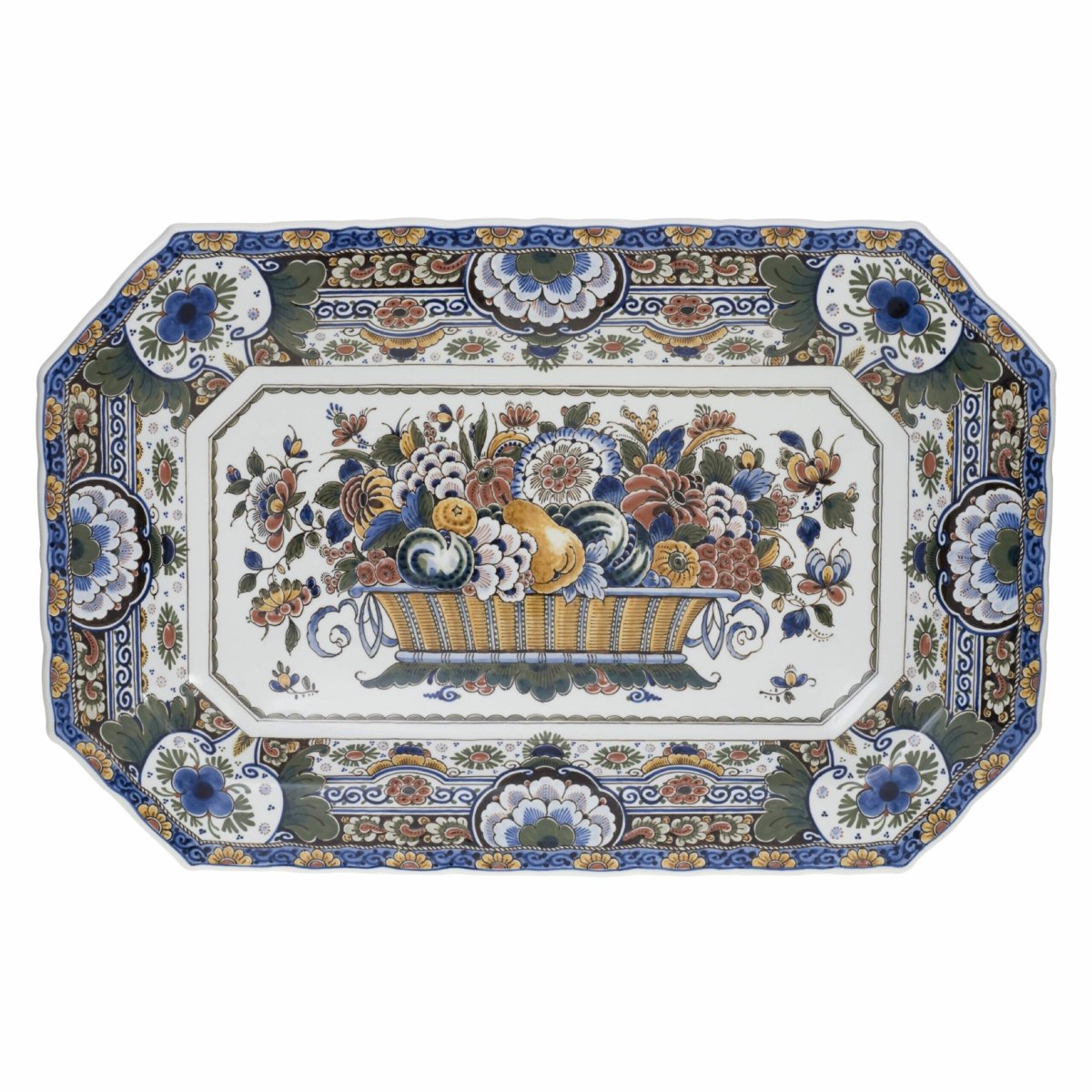 Dit grote rechthoekige bord is een echt spektakelstuk in elk interieur. De grote mand in het midden is gevuld met verschillende soorten fruit en bloemen en het geheel wordt omlijst met een brede rand.