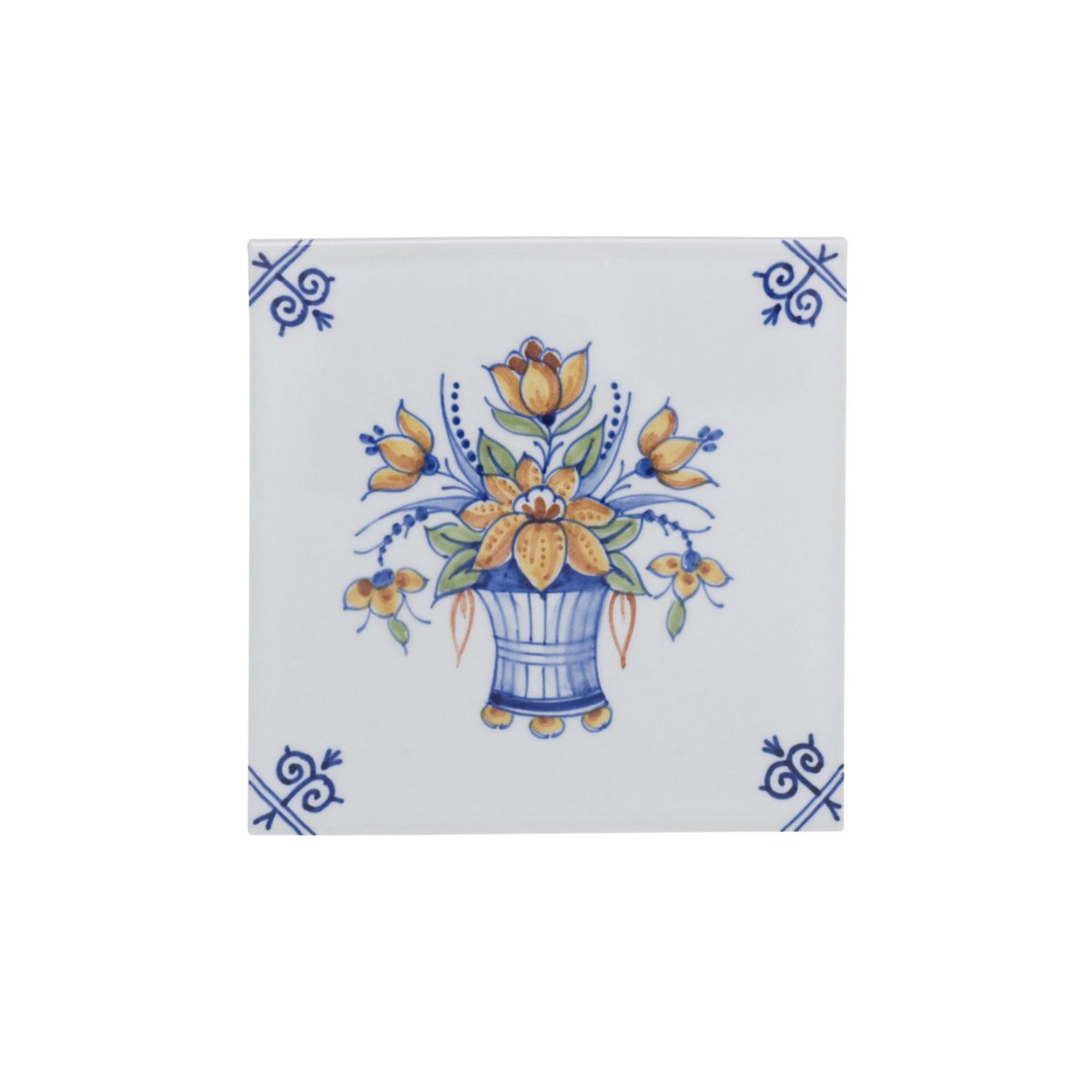 Versier uw huis met deze polychrome tegel met bloemdecoratie. Doordat de tegel met de hand geschilderd is, is geen enkel exemplaar hetzelfde. De gele bloemen op deze tegel worden gepresenteerd in een houten pot.