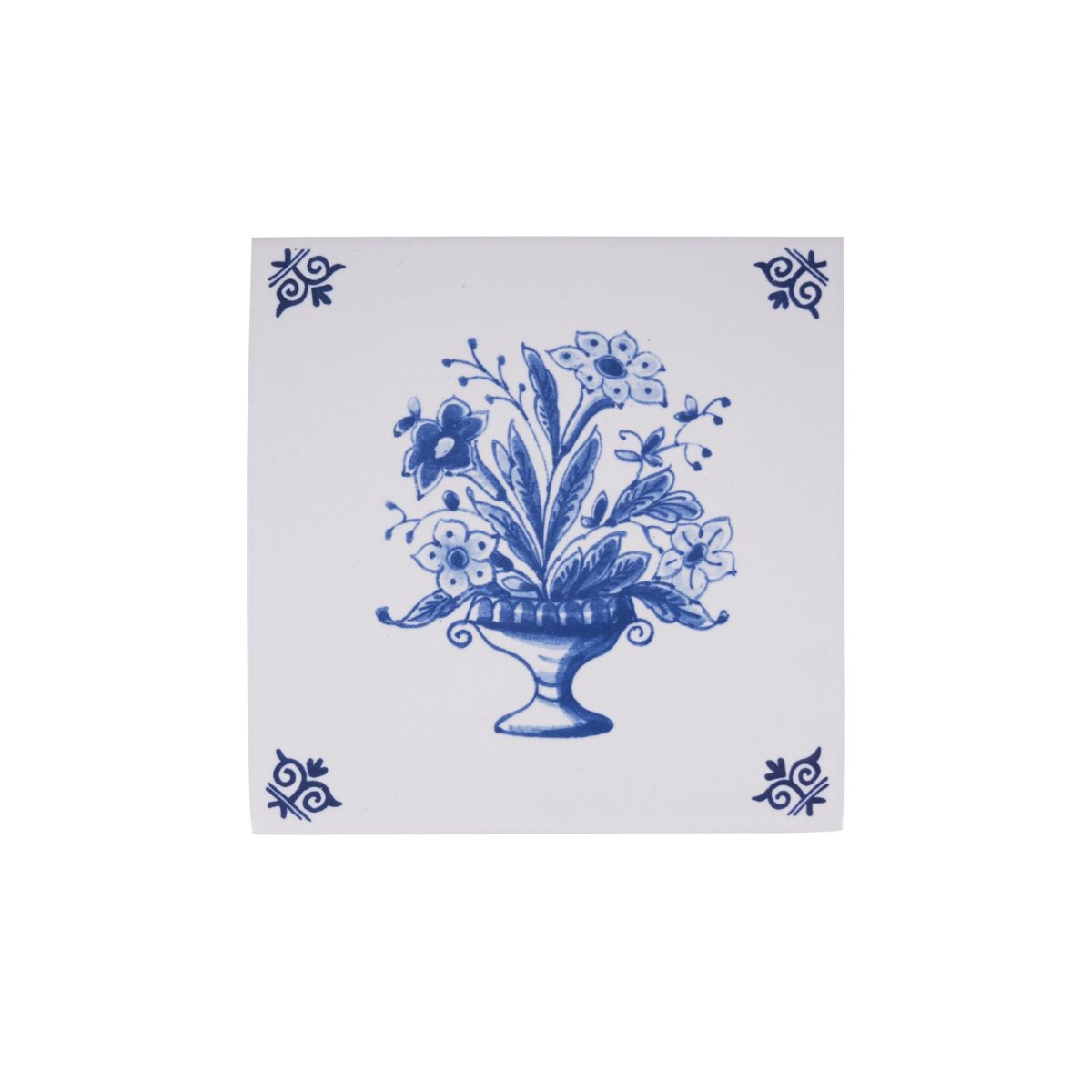Versier uw huis met deze prachtige Delfts blauwe tegel van Royal Delft. De decoratie op de tegel is getekend door een van onze meesterschilders. De decoratie is aangebracht met de transfertechniek. Een groot boeket bloemen zit in een klein bloemenmandje.