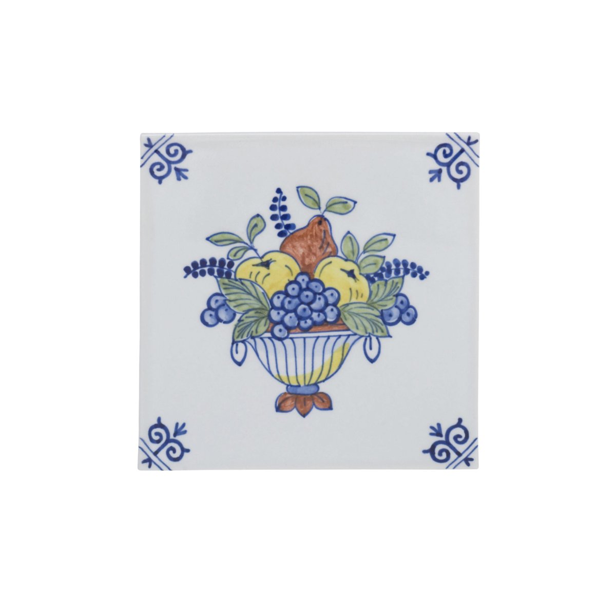 Versier uw huis met deze polychrome tegel. Doordat de tegel met de hand geschilderd is, is geen enkel exemplaar hetzelfde. De zomerfruitmand op deze tegel is gevuld met bosbessen, citroenen en een peer – een verrukkelijke tegel.