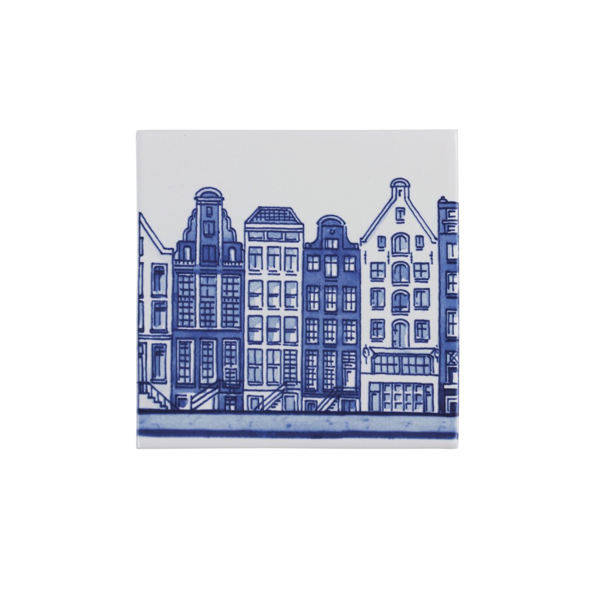 De karakteristieke grachtenpanden van Amsterdam door middel van zeefdruk toegepast in Delfts Blauw. In totaal zijn er 5 tegels met de beroemde Nederlandse grachtenpanden in Delfts Blauw.