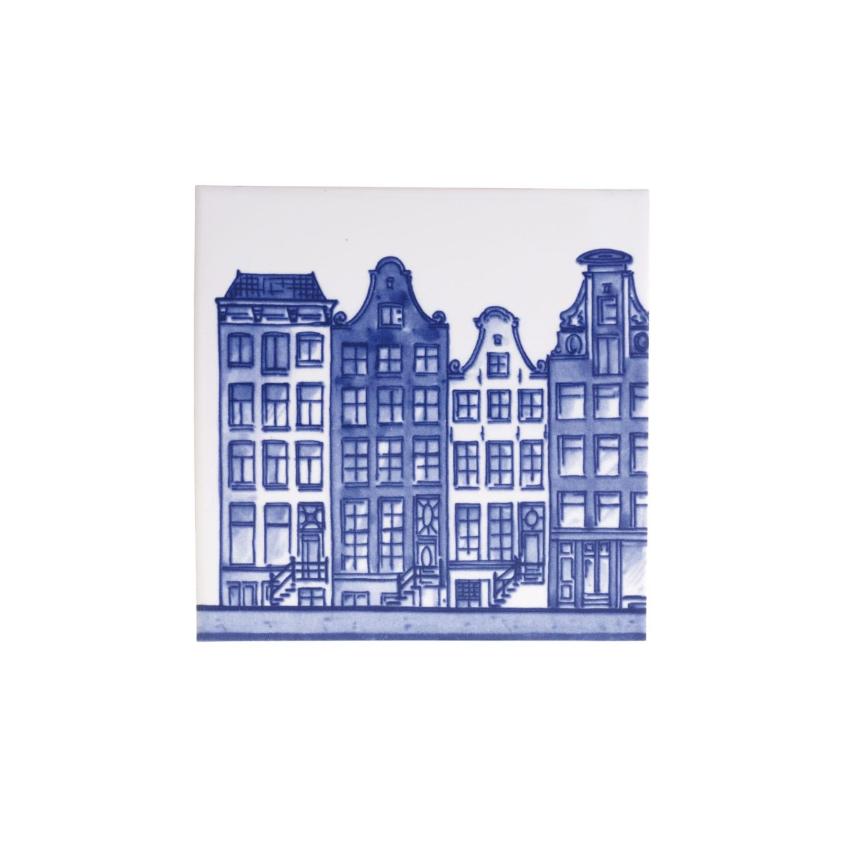 Deze Delfts Blauwe tegel met een afbeelding van Amsterdamse grachtenpanden is de derde in een serie van 5. Verzamel alle Delfts Blauwe tegels om de serie compleet te maken. De afbeelding is aangebracht door middel van zeefdruk in Delfts Blauw.