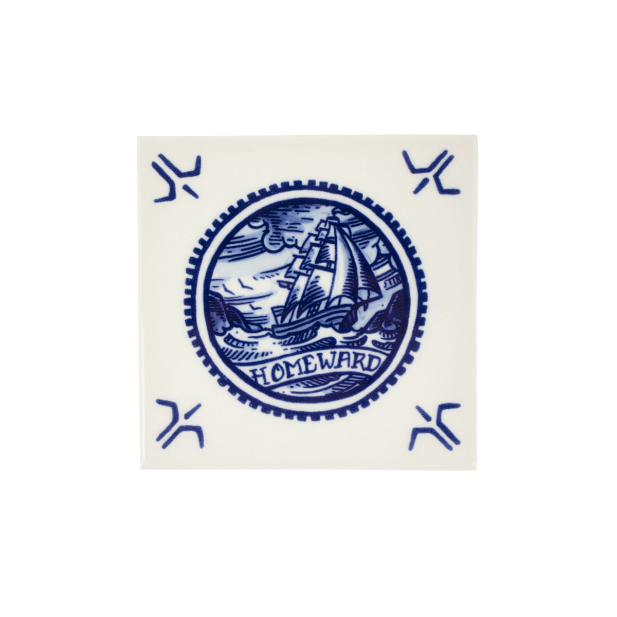 Op deze tegel zien we een schip dat in stormachtig weer probeert thuis te komen. Veel zeelui hadden symbolische tatoeages op hun lichaam. Tatoeages die hen herinnerden aan het thuisfront en de liefde. Nog steeds is de scheepvaart een geliefd onderwerp om te tatoeƫren.