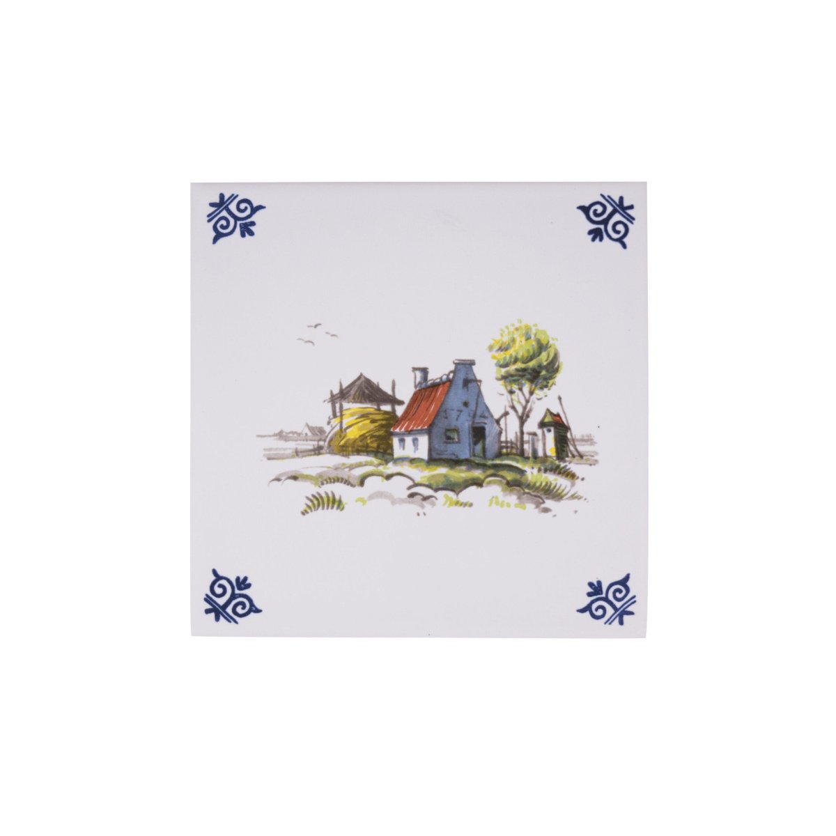 Versier uw huis met deze polychrome tegel. De kleuren in deze tegel zijn geïnspireerd op de kleuren van het Middellandse-Zeegebied. Op deze tegel staat een klein huis in het veld.