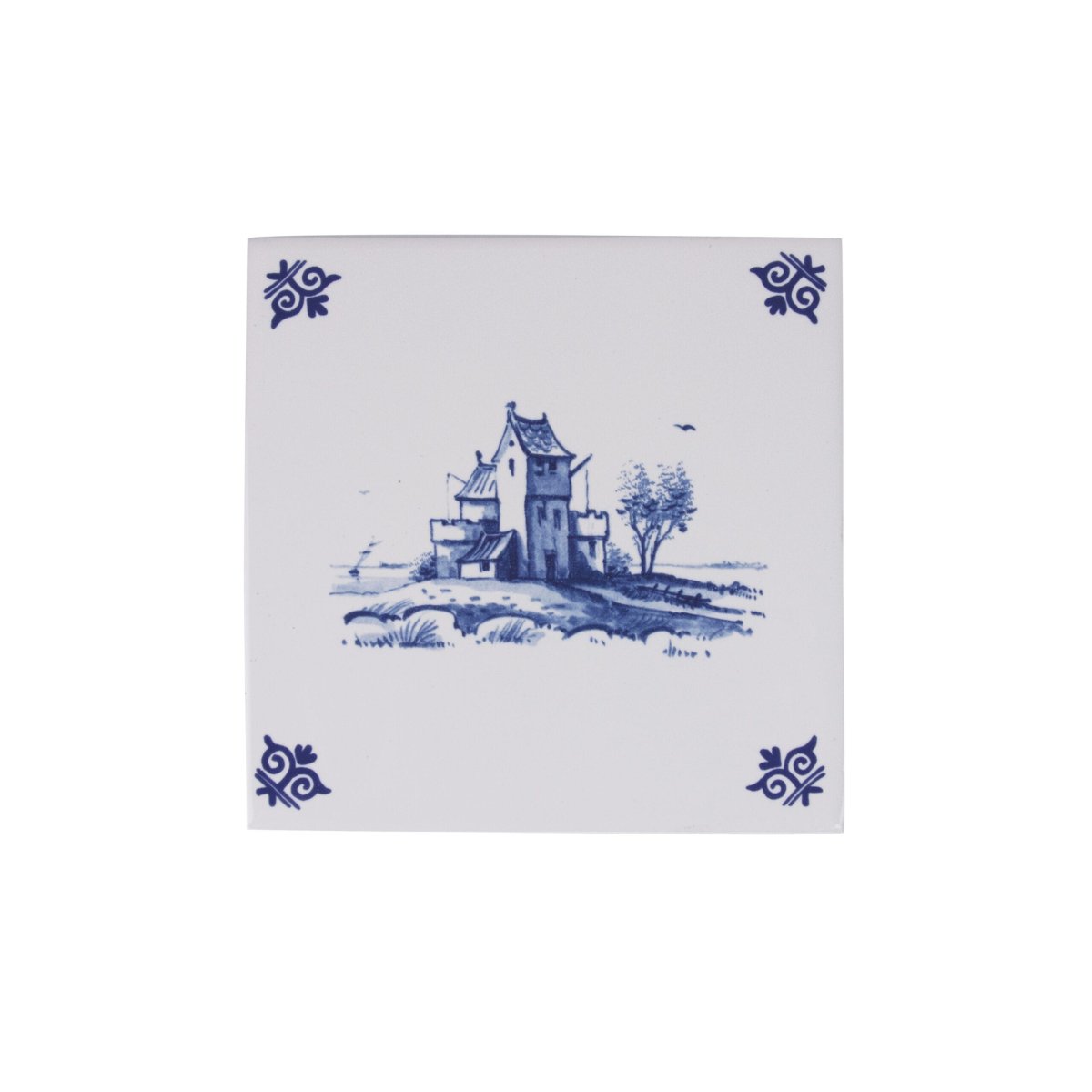 Versier uw huis met deze prachtige Delfts blauwe tegel van Royal Delft. De decoratie op de tegel is getekend door een van onze meesterschilders. De decoratie is aangebracht met de transfertechniek. Een groot huis staat in de velden ergens in Nederland.