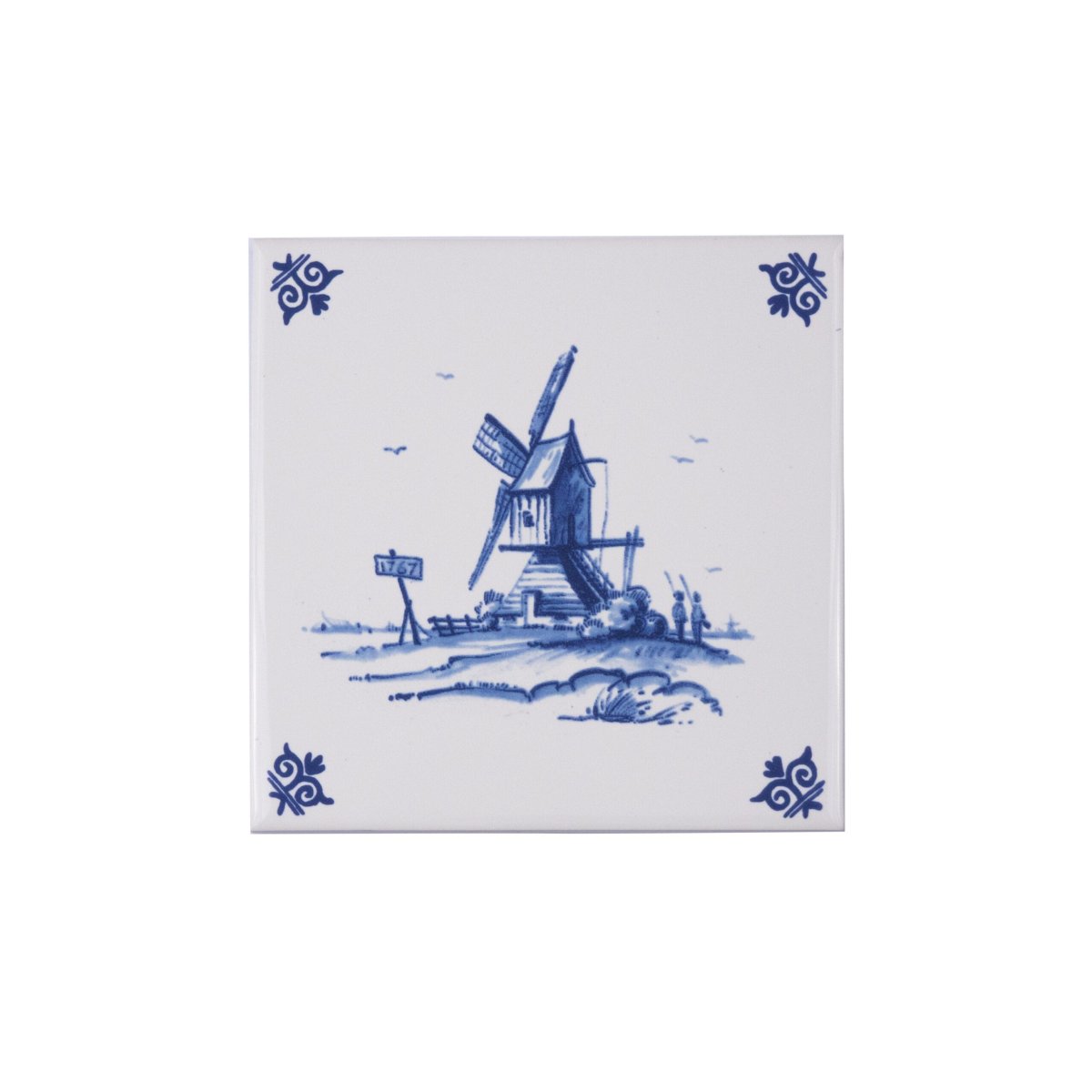 Versier uw huis met deze prachtige Delfts blauwe tegel van Royal Delft. De decoratie op de tegel is getekend door een van onze meesterschilders. De decoratie is aangebracht met de transfertechniek. We zien een traditionele houten molen in de velden.