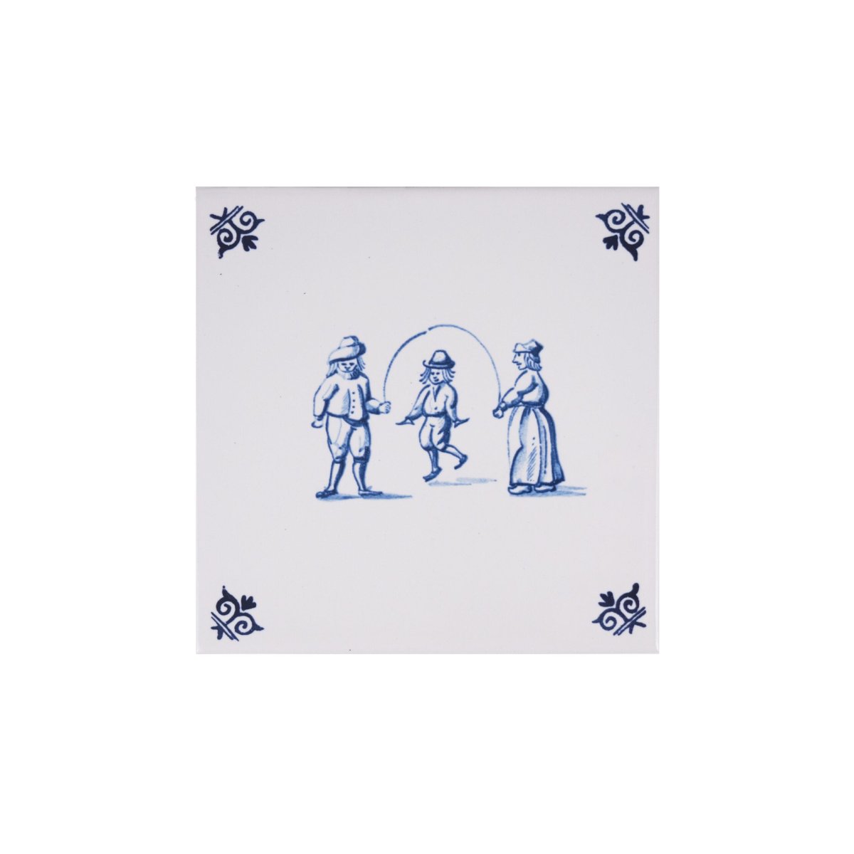 Versier uw huis met de nostalgische Delfts Blauwe tegels van Royal Delft. Op deze tegel staat springtouw. De decoratie is getekend door een van onze meesterschilders en wordt aangebracht met behulp van de transfertechniek.
