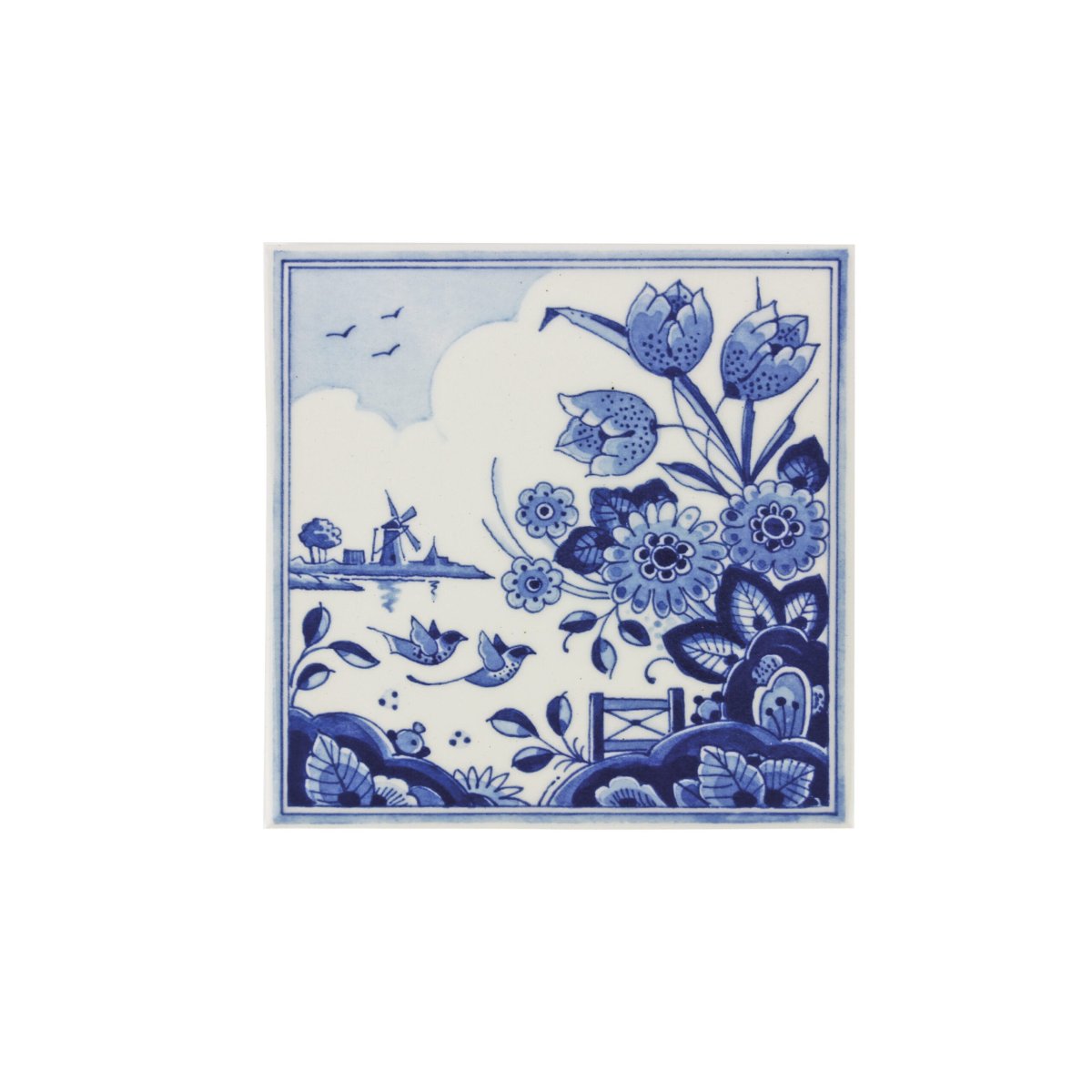Deze Delfts Blauwe tegel met tulpenlandschap is een modernere versie van de Delfts Blauwe landschappen die bij Royal Delft zijn geschilderd. De afbeelding is met behulp van een zeefdruktechniek aangebracht, zodat de diepte van de tekening duidelijk zichtbaar is.