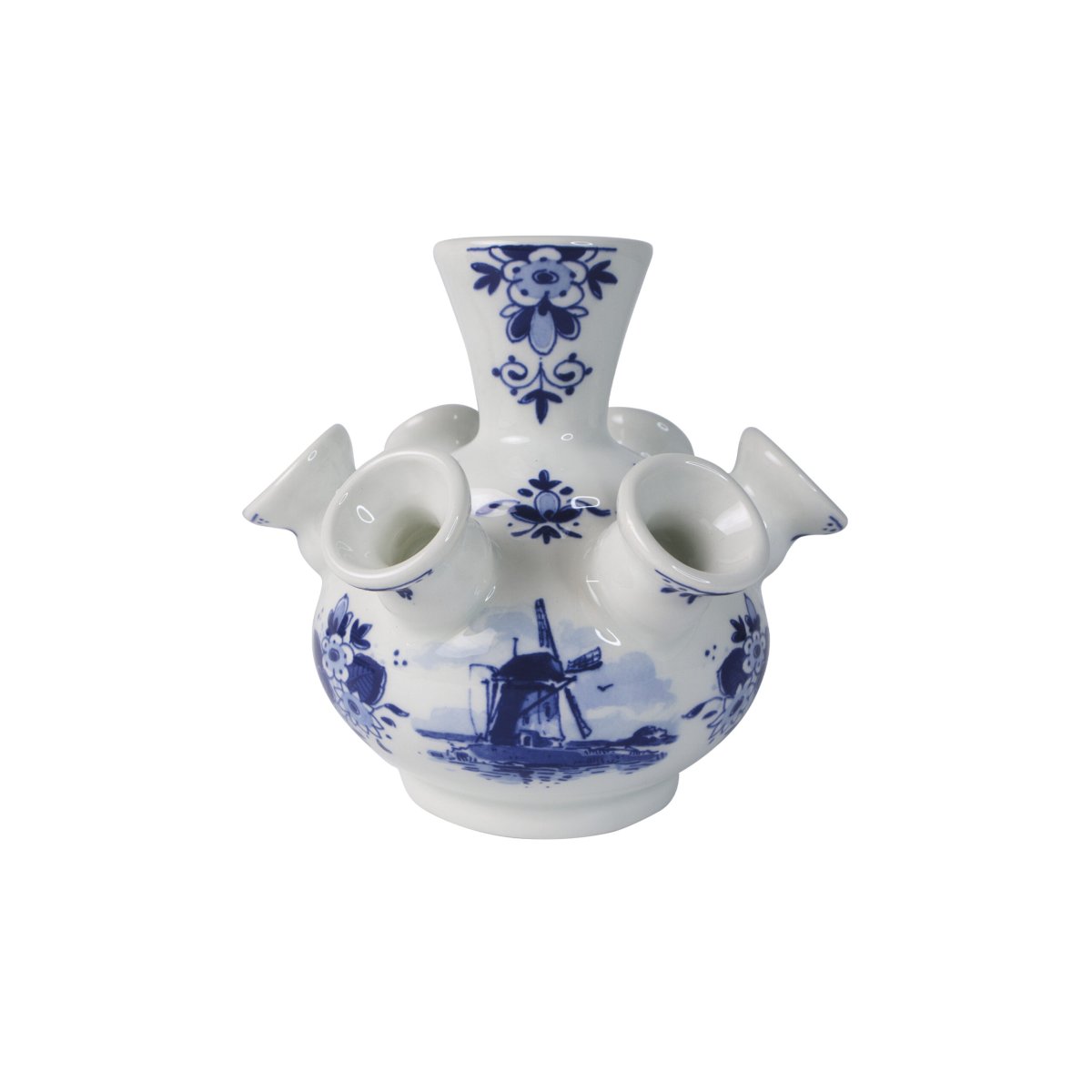Deze kleine tulpenvaas met molen van 13,5 cm hoog komt uit de Blueware collectie van Royal Delft. Onze Blueware collectie is gebaseerd op traditionele decoraties. Het ontwerp van de collectie is van de hand van een Royal Delft schilder, het decoreren ervan gebeurt met een zeefdruk techniek. Deze techniek wordt al sinds het einde van de 19e eeuw door Royal Delft toegepast. Dit ronde tulpenvaasje geeft de mogelijkheid om 6 bloemen klassiek te presenteren.