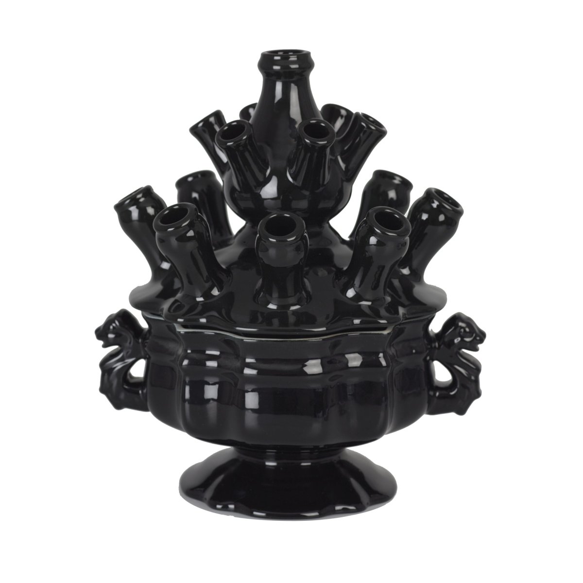 De vorm van deze tulpenvaas is ook als gedecoreerde Delfts Blauwe versie in onze collectie terug te vinden, maar het weglaten van de decoratie en het aanbrengen van een enkelvoudig zwart glazuur geeft het een moderne twist.