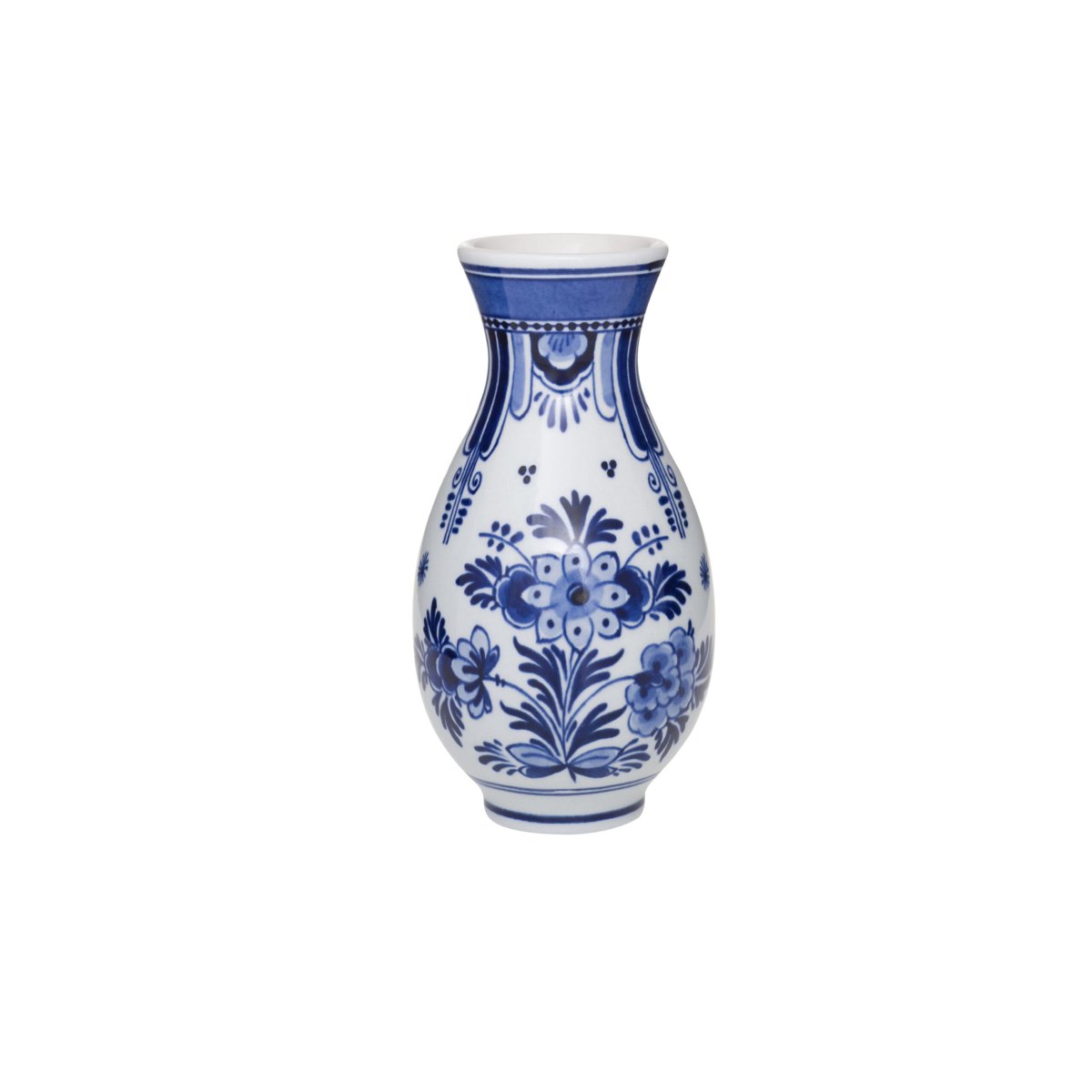 Deze handgeschilderde Delfts Blauwe vaas heeft de kenmerkende signatuur van Royal Delft als decoratie. De complexiteit van het Delfts Blauwe schilderwerk zit in de welving van de vaas.
